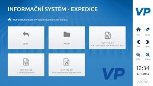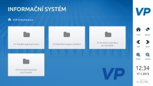 Díky napojení aplikace na síťový (lokální) disk ve firmě, jakožto zdroje zobrazovaných informací, se jednotlivé složky na vstupní obrazovce adekvátně a automaticky mění a pojmenovávají podle struktury síťového disku.